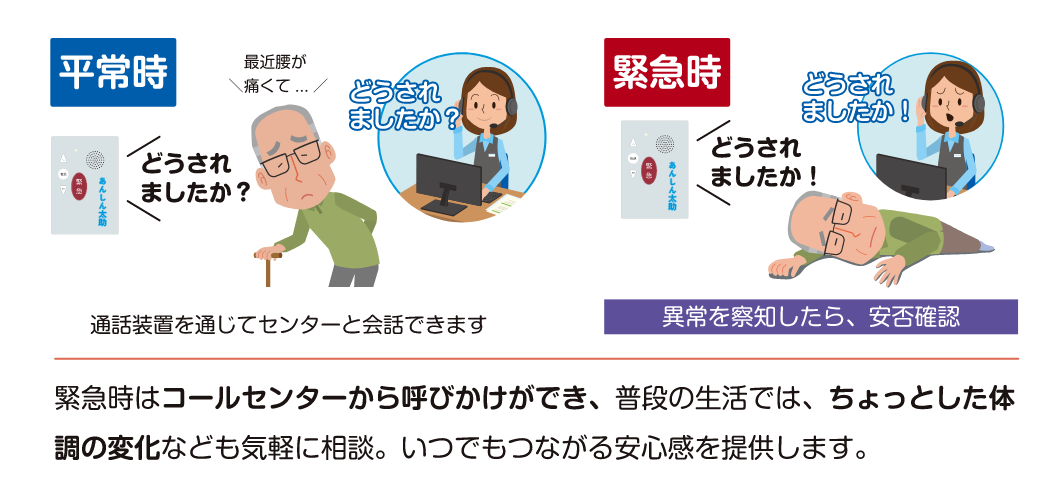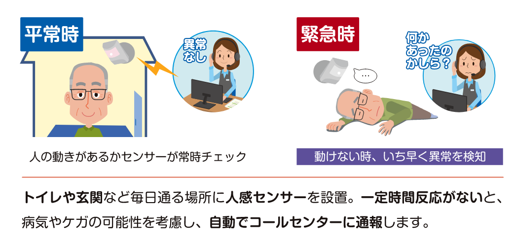 すべてのサービス込みの一律価格だから安心コールシステム本体(回線が無い場合は無線対応)、ペンダント型発信機、外出センサーと安否センサーの2種類の人感センサー、サービスのすべてを含んだ安心一律価格です。安否センサーは、ご自宅の間取りや生活パターンを調査の上、ご利用者の状況に応じて、設置個所、設置数*、安否確認時間を調整します。また、外出センサーは、玄関に設置して家を留守にするとセンターに自動信号を発信するので、外出先から戻らないなどの緊急事態にも対応します。