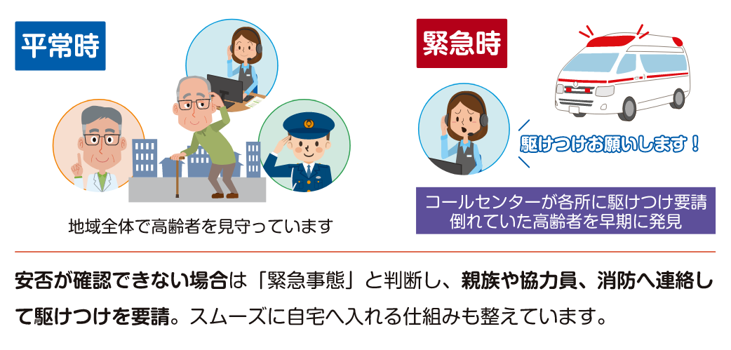 ご高齢者や離れて暮らすご両親をご家族に代わって見守るサービスです。通報があればご家族や協力員に迅速連絡、必要時は提携業者が駆けつけます。健康相談や救急ボタン、一定時間の動きがない場合は自動通報など、多彩な機能で一人暮らしでも安心です。